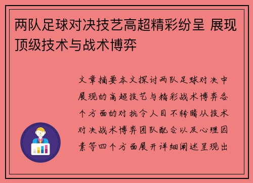 文章摘要:本文探讨两队足球对决中展现的高超技艺与精彩战术博弈,各个方面的对抗令人目不转睛。从技术对决、战术博弈、团队配合以及心理因素等四个方面展开详细阐述,呈现出足球比赛的魅力与精彩。通过对这些方面的深入分析,让读者深刻感受到足球运动之美。