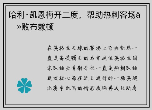 在英格兰足球的赛场上,哈利·凯恩一直是备受瞩目的名字,这位英格兰国家队的头号射手也一直是热刺队的进攻核心。而在近日进行的一场英超比赛中,凯恩的精彩表现再次让所有人见识到了他无可比拟的进球能力。作为热刺的领军人物,凯恩凭借一己之力带领球队客场3-1击败布赖顿,梅开二度的他用实际行动证明了自己在关键时刻的价值。